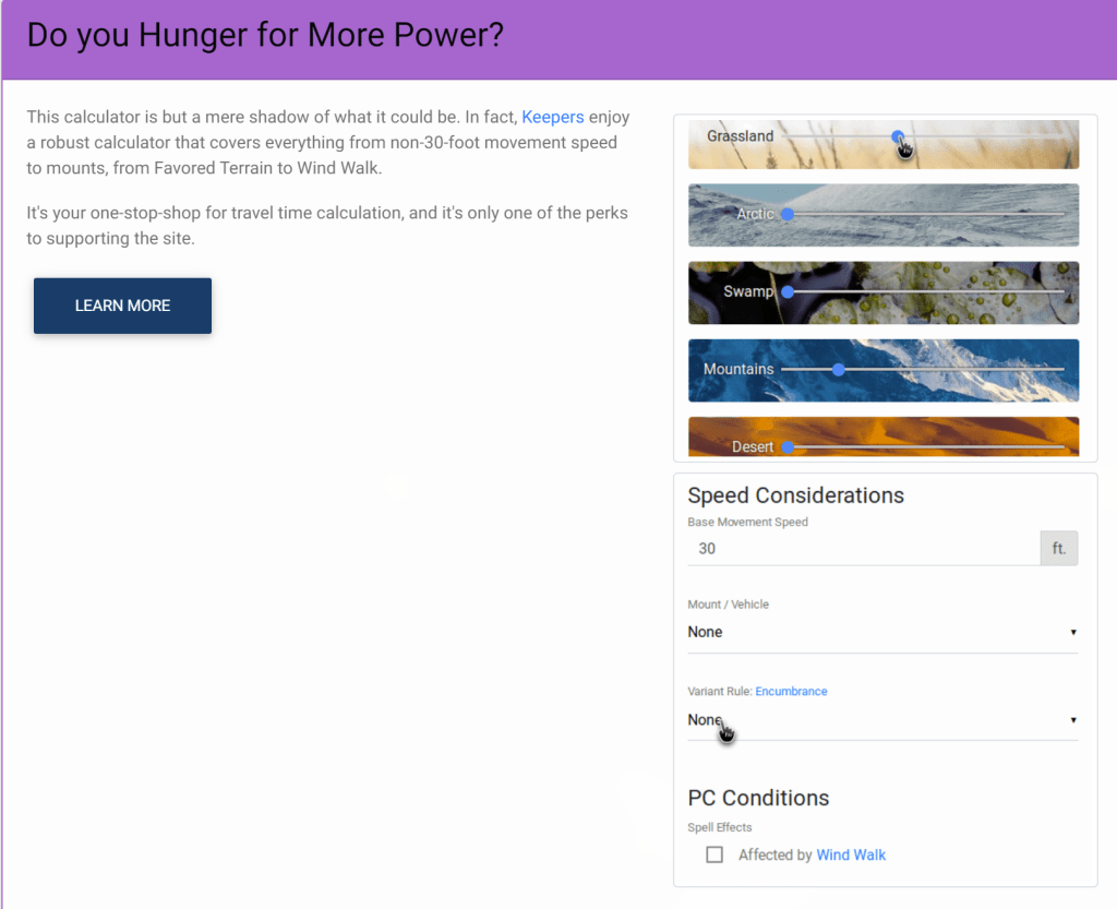The travel calculator seems solid, but is really paywalled so I didn’t dive deep. By default it you enter distance, pace, and how many hours of travel per day. It tells you how long it takes. Pretty straight forward, and I don’t know that I’d find value, except their premium level adds things like terrain, mounts, vehicles, spell effects, favored terrains, encumbrance, searching or not, and what looks like tons of other stuff. This sounds great.