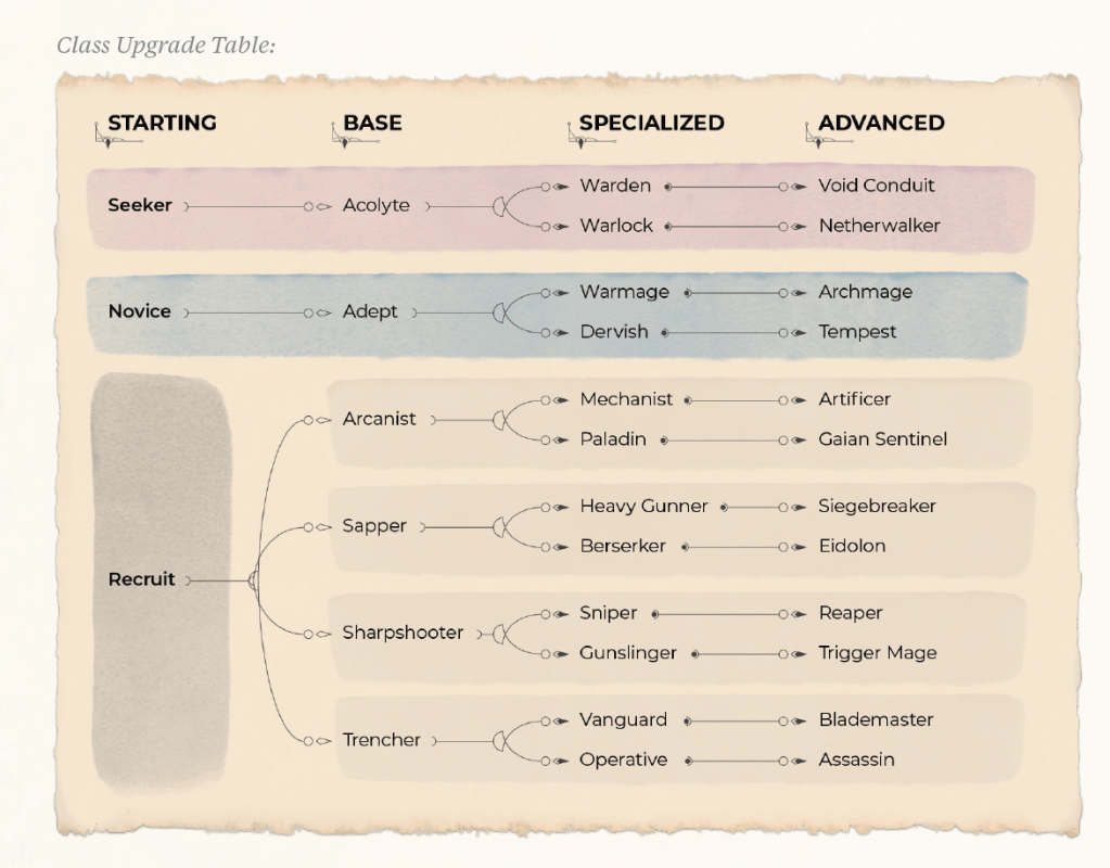 First level characters pick between Recruits (soldier types), Novies (wizard types), Seekers (spiritualist types) and then can specialize as they go into 2nd level. Later (CH 5), the book explains that you pick advanced and more specialized classes at higher levels. For a book this focused on readability, I’d have included those options here, or at least before the skills and how to play chapter. I have a hard time making a choice this impact-full to my character without knowing how it will turn out.