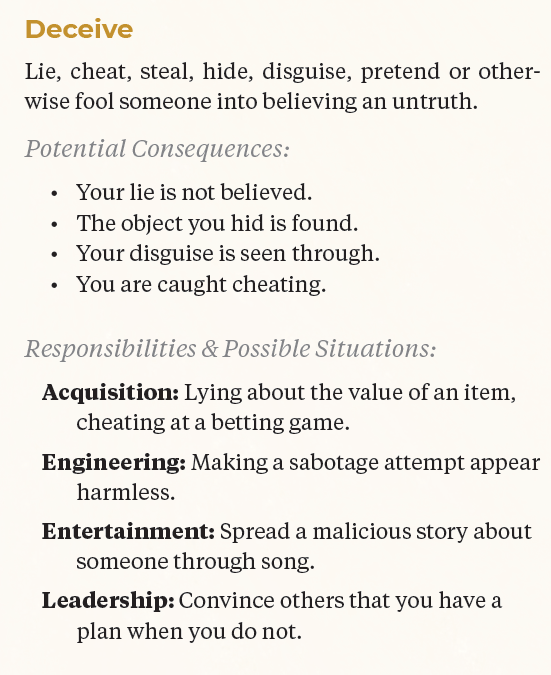 You can use Acquisitions to make Deceive checks to make things seem more expensive than they are, but you can use Entertainment to spread gossip through song. Its an interesting way to handle skills and their use, that gives a wide variety of options. It also eliminates the “I have high str, but my intimidate is low because my cha is low” question that comes up a lot in other games. The page I got the Deceive info from would make a really handy hand out to keep pinned to a GM screen, or for players, especially new ones, to inspire them to use responsibilities with skills.