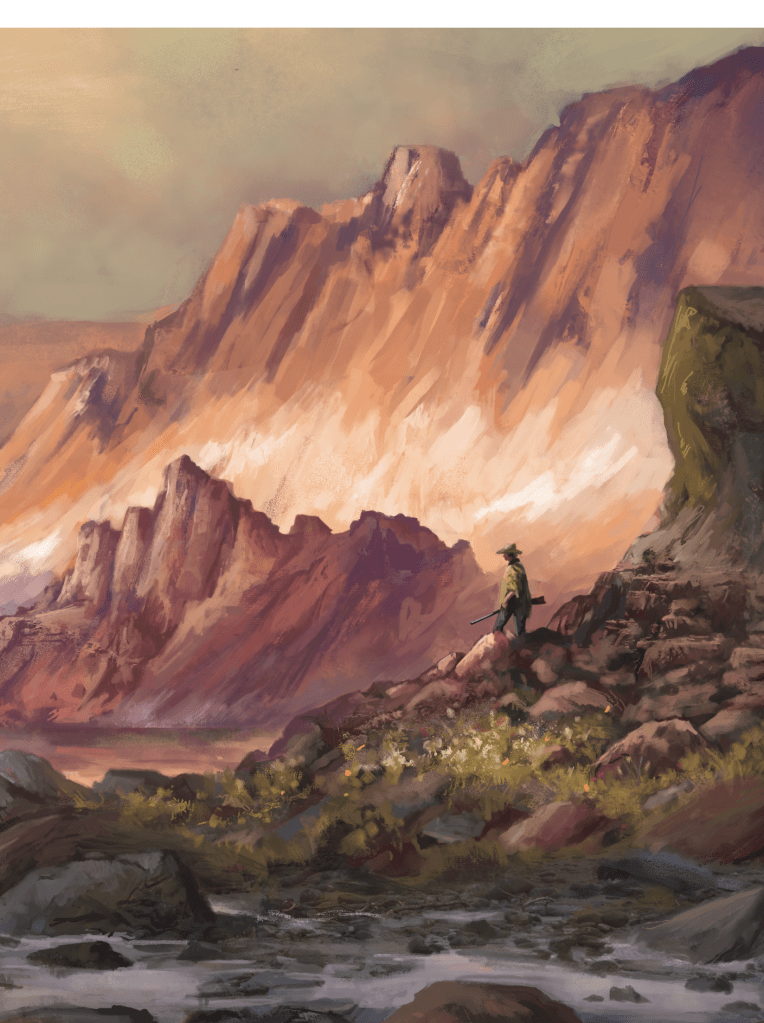 The book itself is chock full of art, and they clearly made use of their 22 artists. Each of which gets a plug at the end of the book with social media entries, and portfolio links in case you want to find them (I know I’ve followed a few new twitter accounts). All the art is professional, well done, and gets the image across. Not all of it’s my personal style, but I’ve got nothing to really complain about. None of the pieces are bad or unhelpful, and the artists have all clearly read the prompt they are drawing. I particularly like the landscapes and big pieces that are included. I’ll highlight other favorites throughout the review. There’s a lot of good stuff here. I think If I had to pick a favorite contributor I’d go with Kii Weatherton, this piece in particular.