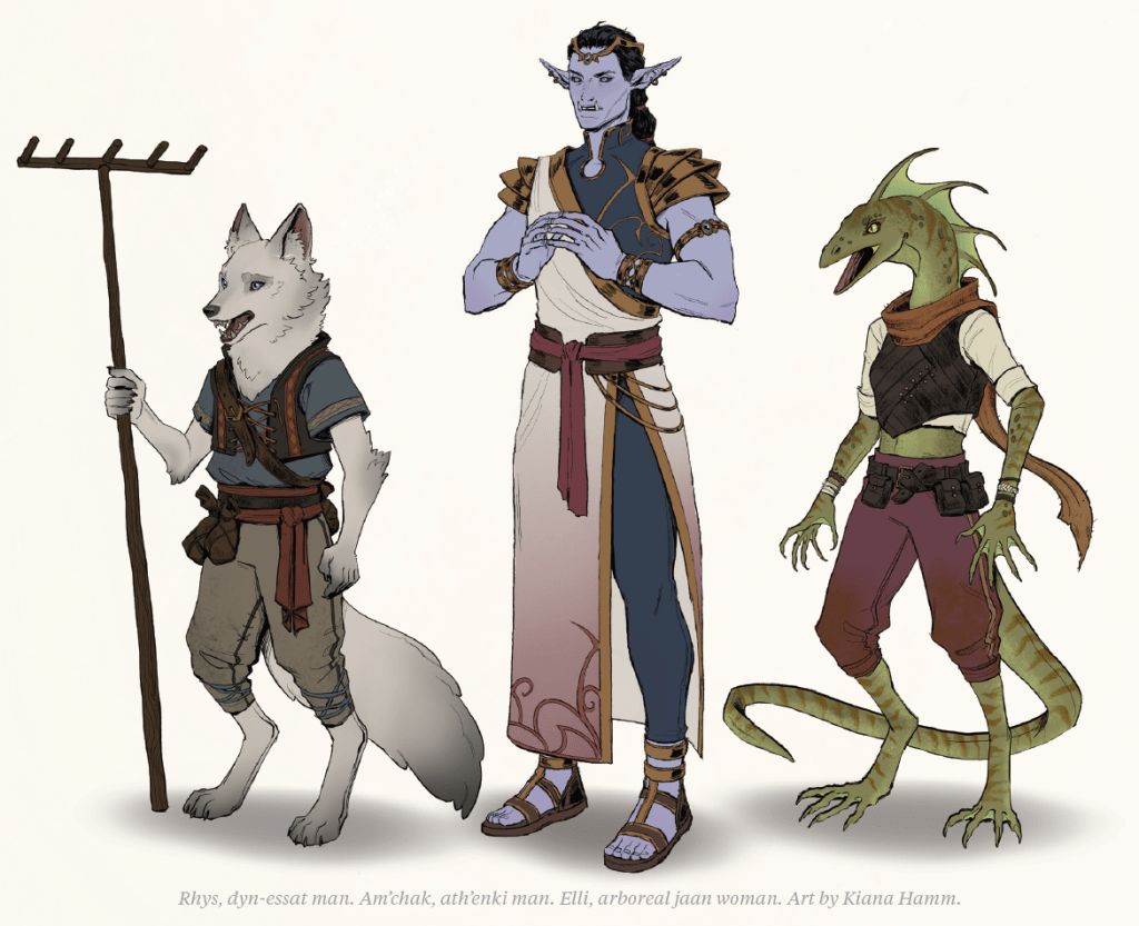 The Jaan are a semi-aquatic lizard people. The notable feature here is the kinship system of relationships. Essentially, to a given Jaan, all of their parents brothers are “father” and their parents sisters are called “mother”. Meaning their cousins are all brother and sister, and nieces and nephews are sons and daughters. It means a Jaan is going to have a large family, and probably a cool source of contacts in game. Especially when one of the other players didn’t read the full setting, and you are introducing them to your 5th or 6th father.