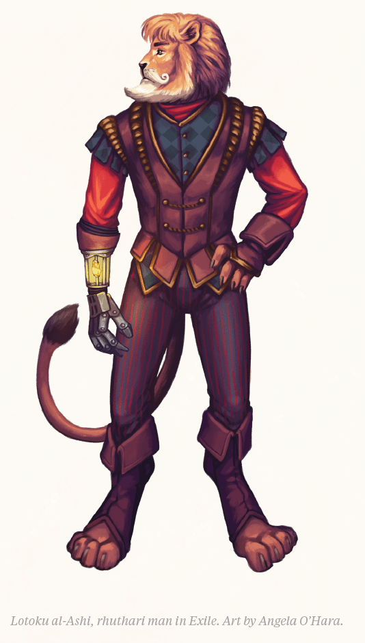 The Rhuthari are a species of big sexy cat people. The book doesn’t call them out that directly, but they are six foot five (converting to Freedom Units from the books metric) and specifically muscular while living on “tropical islands necessitating minimal clothing”. They have a really cool culture, with a pack ranking system based on merit, a cool sun god Baldyr, and a understated sarcastic sense of humor. Plus, if you get exiled, maybe you can play this dandy. This is probably the species I’d end up playing in a Zafir game.