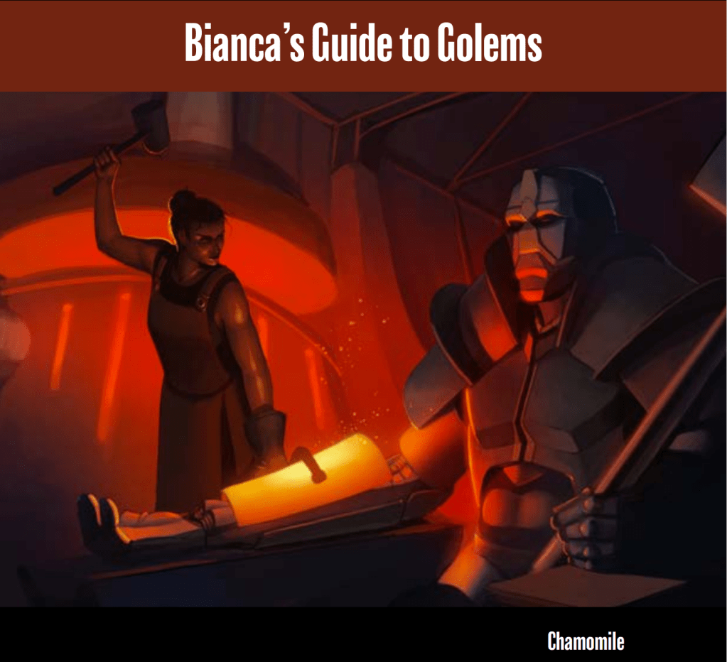Bianca’s Guide to Golems is the third of Chamomile’s series of kickstarter 5e zines. Each of which is focused on a specific topic of D&D that’s always been a little wonky. This one, obviously, is focused around golems, but less obviously, item crafting in general. I’ve got a hard copy, and plan to review that, although the art is screenshots and cropped from the pdf (with permission). You can pick one up at Drivethrough in physical or digital versions. Before I dig in, I do want to disclose that it includes a reference to my product, the Manual of Exotic Materials, and its sequel. They’re pay what you want, and his rules don’t actually require mine, but its would help.