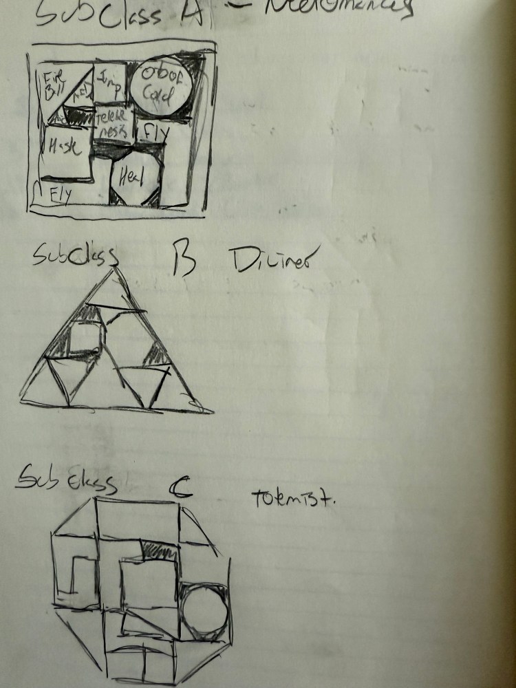 Classes: Your class determines your grid. This grid is where you prepare your spells. So draw it on a paper with dimensions determined by your level. For a square class, maybe a 2×2 at 1st level, but 3×3 at 2nd, 4×4 and so on. This is probably a chart situation for each class, like the spells per day chart in the 3e phb.