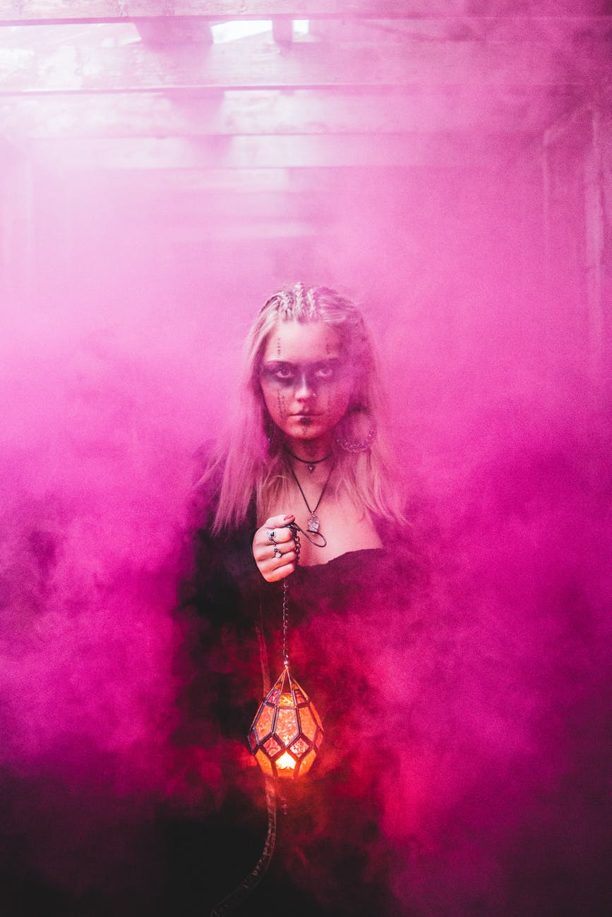 spooky witch with lamp in pink smoke